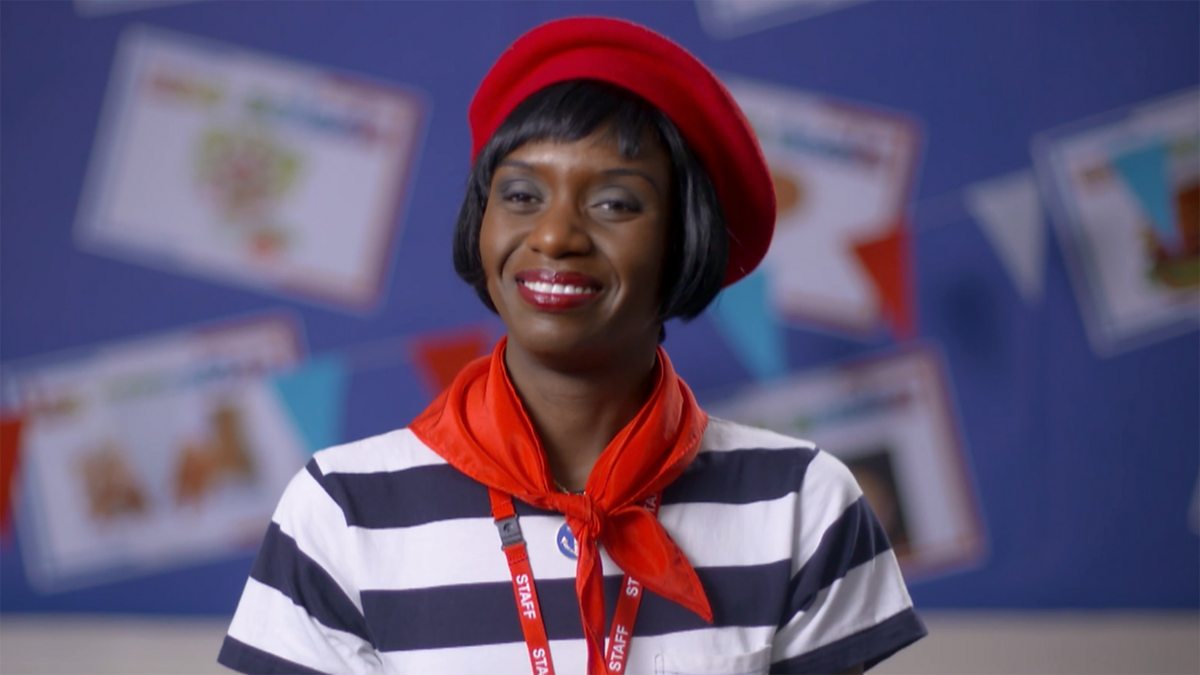 A French teacher speaking with a very obvious English accent, who also repeats the same phrase several times for comic effect.