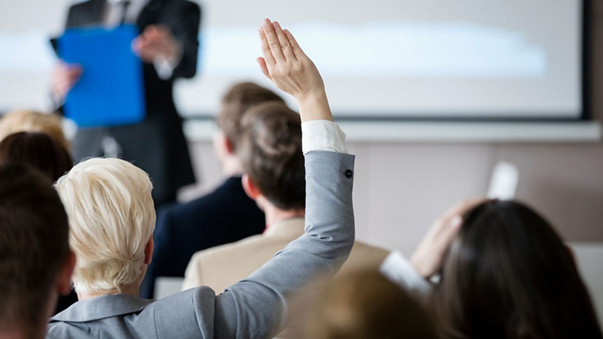 Photo: Woman raising her hand at a meeting Credit: Thinkstock