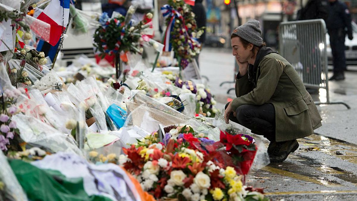 (Photo: Julian Dorio of the US rock group Eagles of Death Metal pays tribute to the victims of the November 2015 attacks on Paris' Bataclan concert hall, by Muslim extremists. Credit: MIGUEL MEDINA/AFP/Getty Images)
