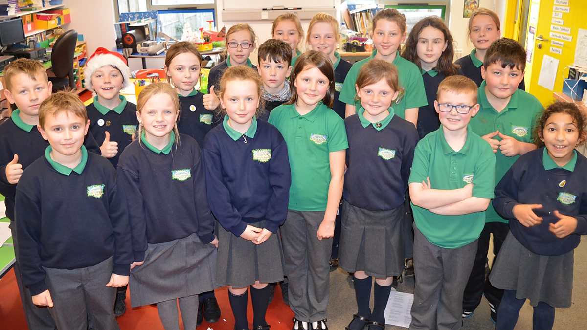 Páistí ó Bhunscoil Bheanna Boirche ag damhsa thart don Nollaig