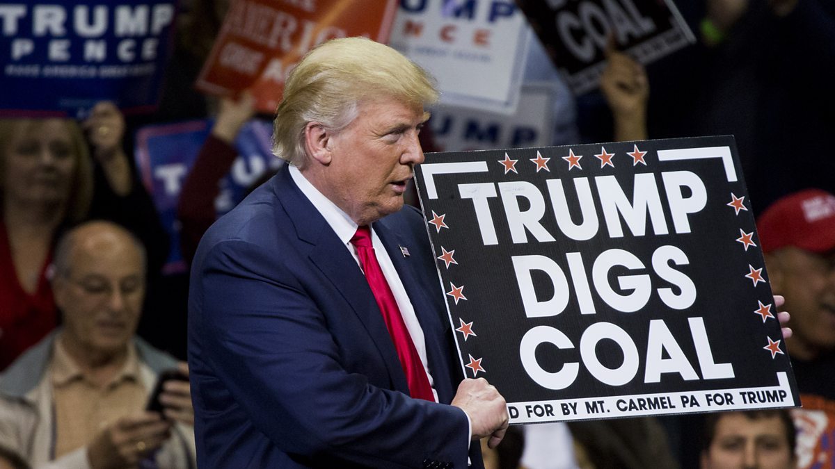 Image: Republican presidential nominee Donald Trump holds a sign supporting coal during a rally at Mohegan Sun Arena in Wilkes-Barre, Pennsylvania on October 10, 2016, credit: Dominick Reuter/AFP/Getty Images