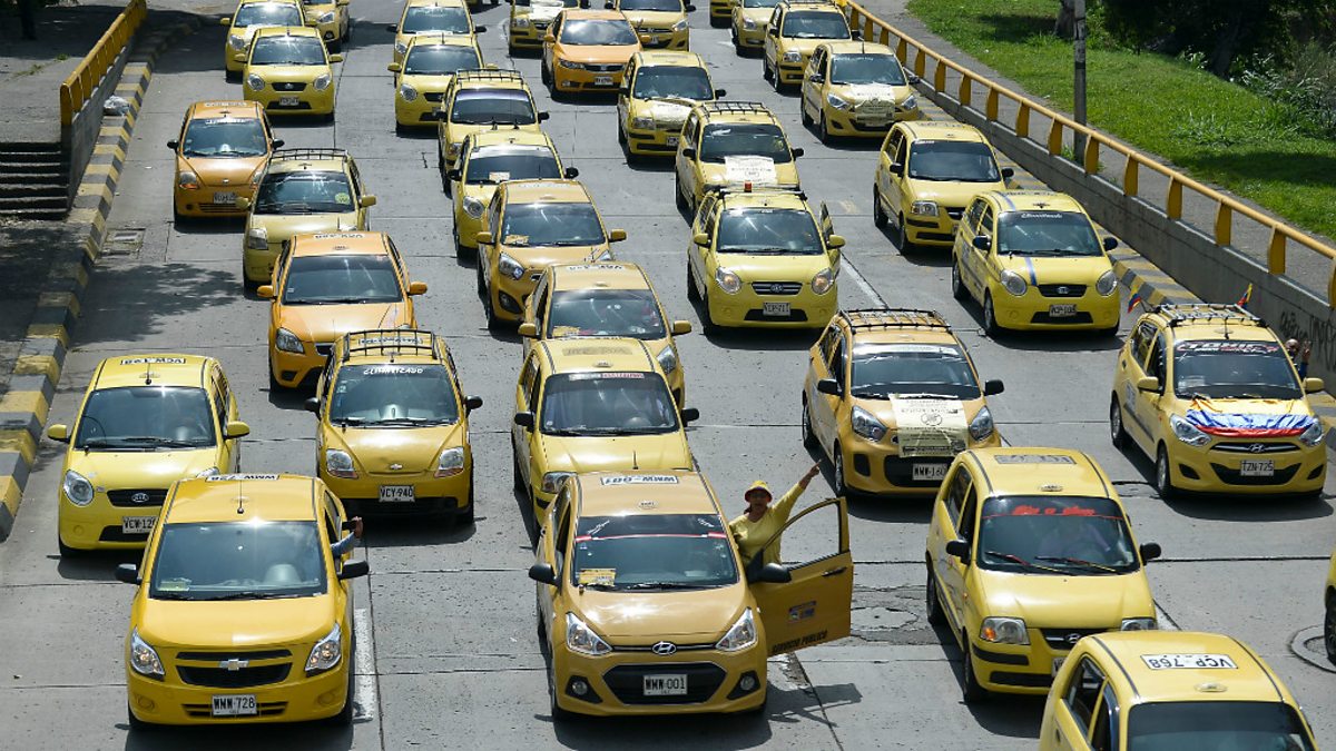 (Image: Taxi drivers demonstrate against Uber, in Cali, Colombia, June 2016, Credit: Luis Robayo/ AFP/ Getty Images).