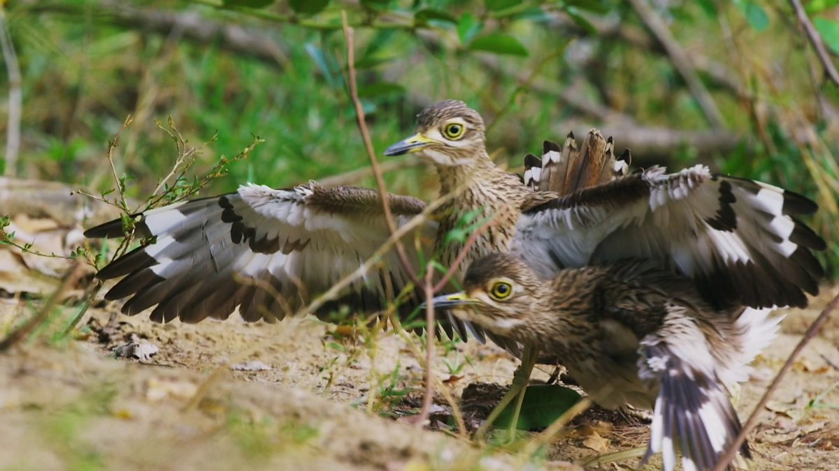 The brave little dikkop bird comes to the rescue of a crocodile to protect her eggs from marauding monitor lizards.
