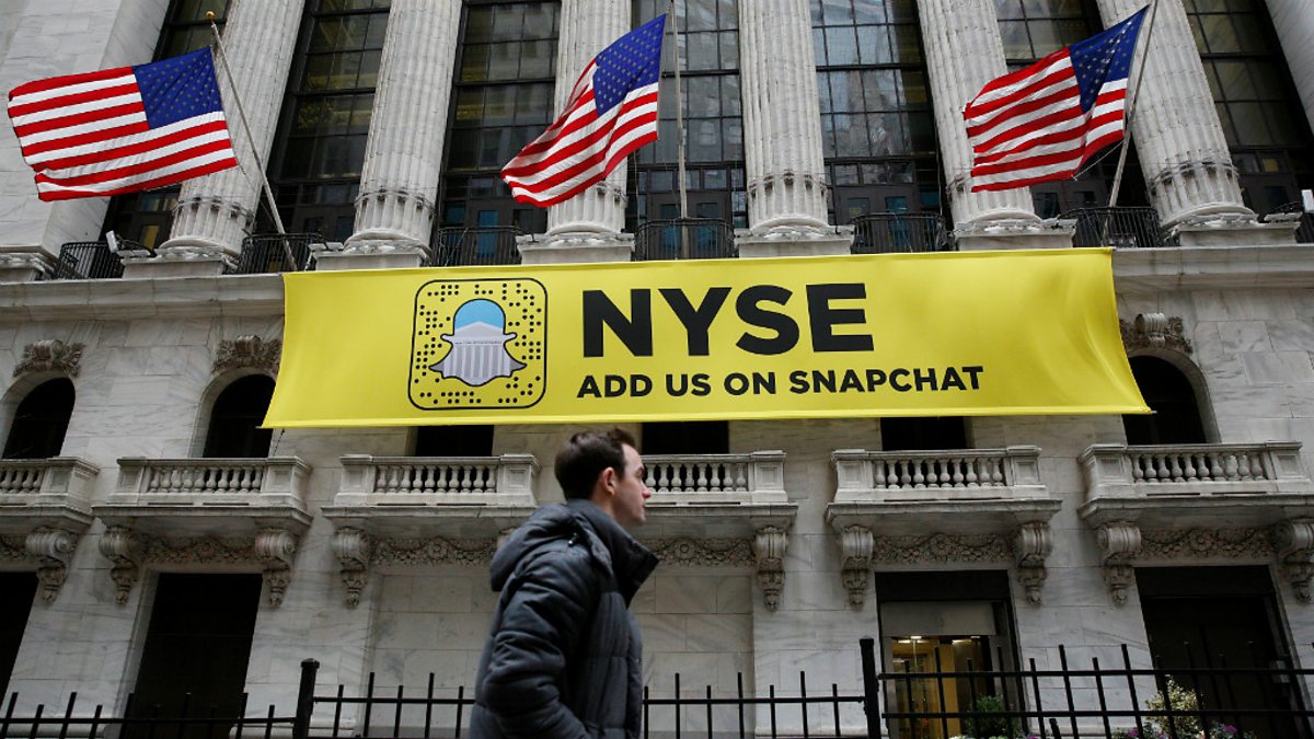 (Image: Snapchat sign hanging on the New York Stock Exchange, Credit: Reuters/ Brendan McDermid).
