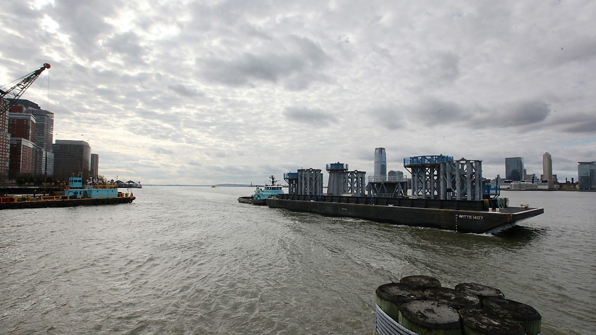(Photo: A barge on the Hudson River heading towards One World Trade Center, December 2012. Credit: Mario Tama/Getty Images)