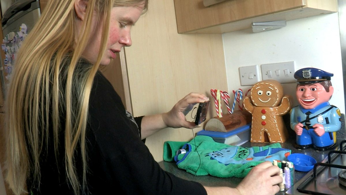(Photo: Vicky, who is blind, using an app to help her sew)