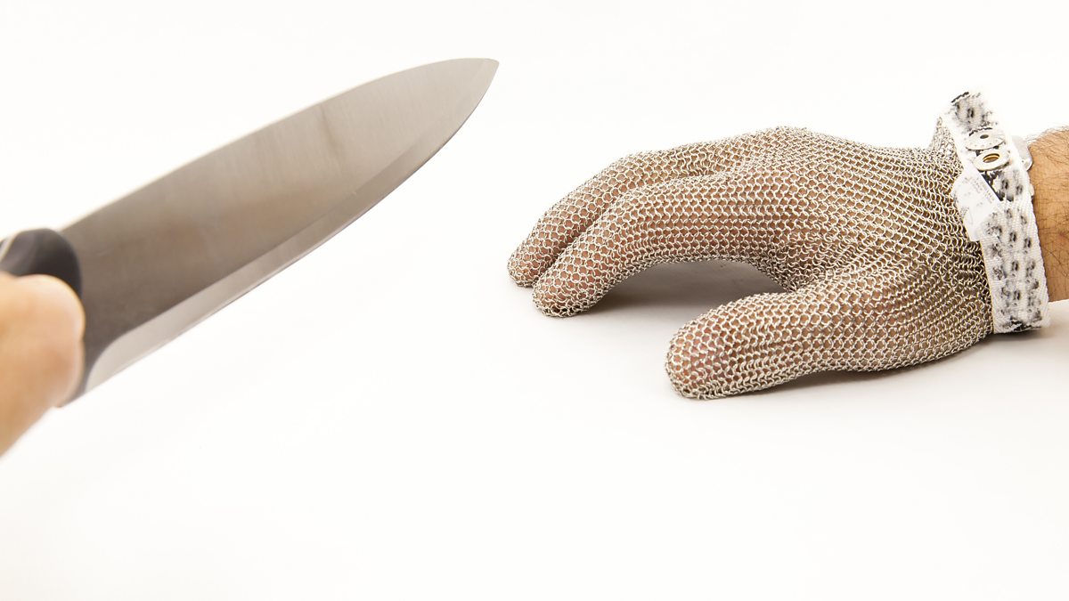 (Photo: A knife next to a hand covered in a protective mesh glove. Credit: fotoedu/Thinkstock)