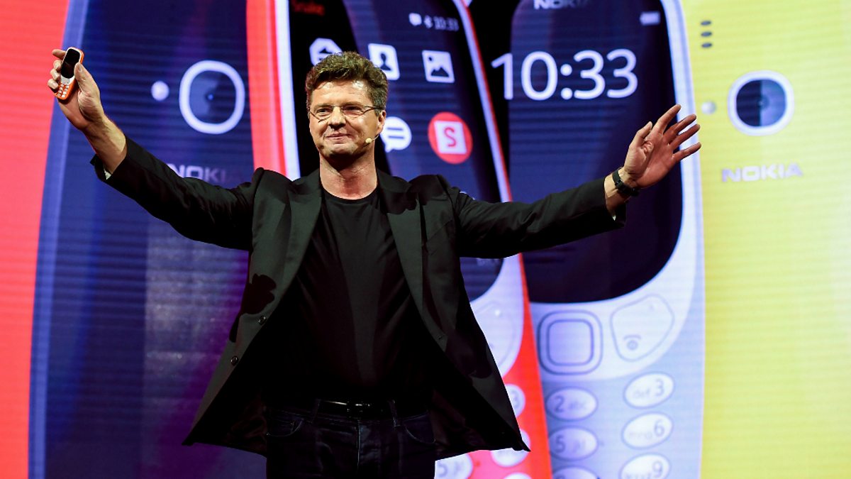 (Image: Arto Nummela of HMD Global, owner of the Nokia phone brand, reveals the relaunched 3310 at a press conference in Barcelona, Credit: JOSEP LAGO/ AFP/ Getty Images).