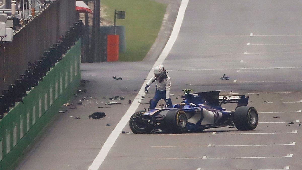 Sauber's Antonio Giovinazzi destroys the front of his car after crashing into the pit wall.