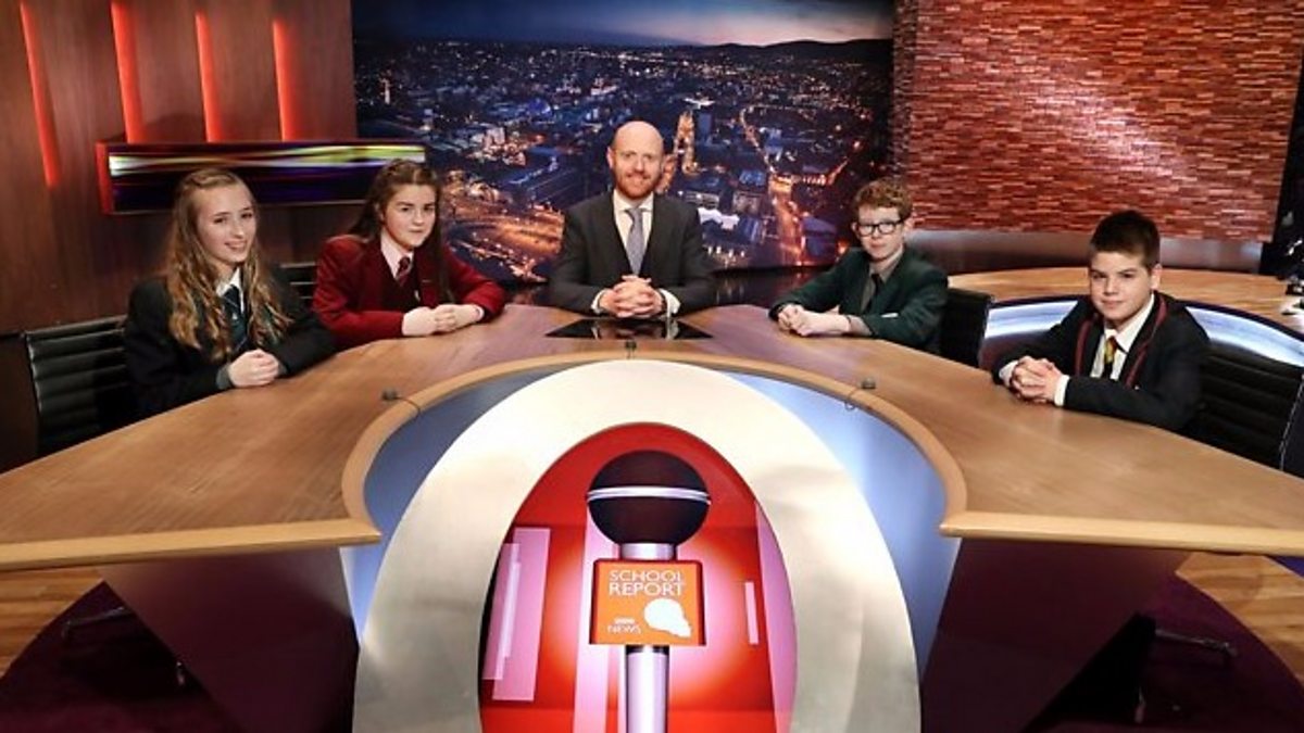 Barra Best hosts a live BBC News School Report programme from Blackstaff Studio, as pupils from across Northern Ireland discuss issues that matter to them. Panellists Fergal McFerran, Jeff Peel, Ursula Murphy, Dr​ Victoria Simms, James Huish and Anita Dennison answered questions from children in the studio.