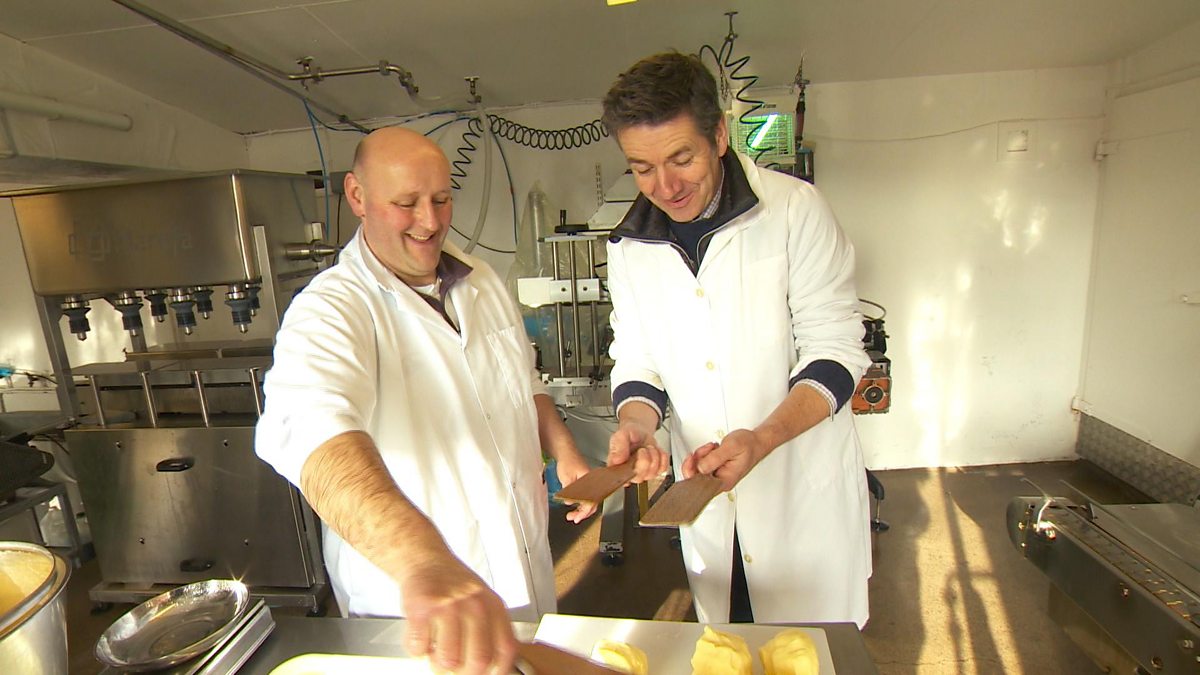 Dougie visit North Street Dairy in Forfar – one of the last remaining dairies to do doorstep deliveries of milk in glass bottles. After helping out with the early morning deliveries Dougie gets a lesson in butter-patting from dairy owner, Hamish Millar.