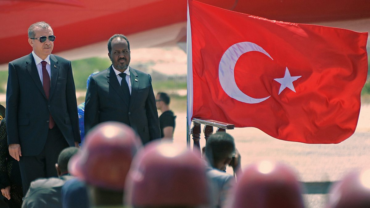 Image: Turkish President Recep Tayyip Erdogan ( L) beside Somali President Hassan Sheikh Mohamud, at Aden Abdulle international airport, Mogadishu, Somalia, 2015