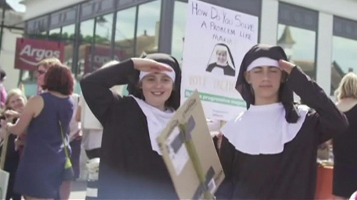 Aerobics, haystacks and magnets, and a tongue-in-cheek claim about the "greatest election video ever", along with fake nuns and an offer from the artist Banksy feature in the penultimate election campaign report from Ellie Price.