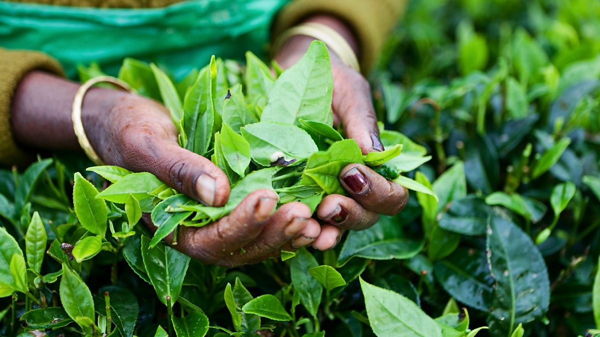 (Image: Hands holding picked tea leaves. Credit: Getty Images)