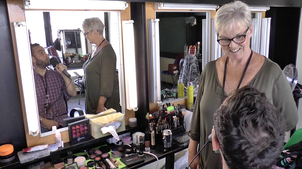 Daf James yn sgwrsio gyda Babs Roberts, un o'r pobol sy'n gyfrifol am y colur yng nghystadleuaeth Canwr y Byd.