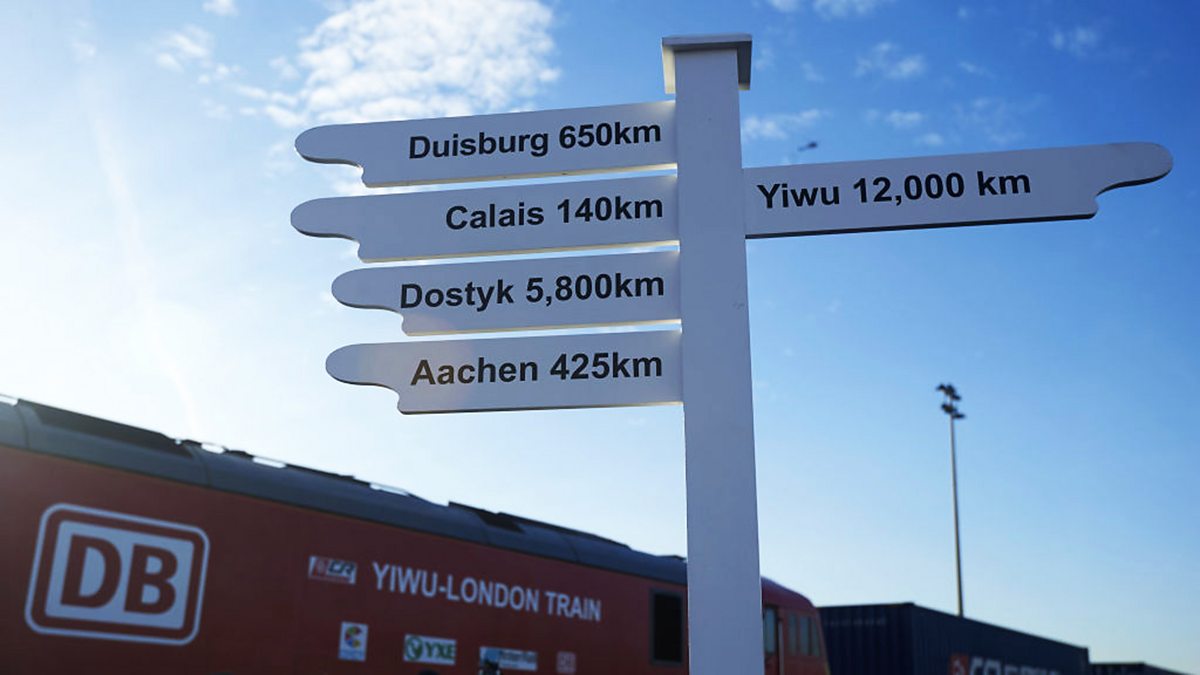 (image: Signpost showing distances to various destinations as a freight train arrives in London from Yiwu - the latest effort in China's drive to strengthen trade links along a modern-day Silk Road. Credit: Niklas Halle'n/Getty Images).