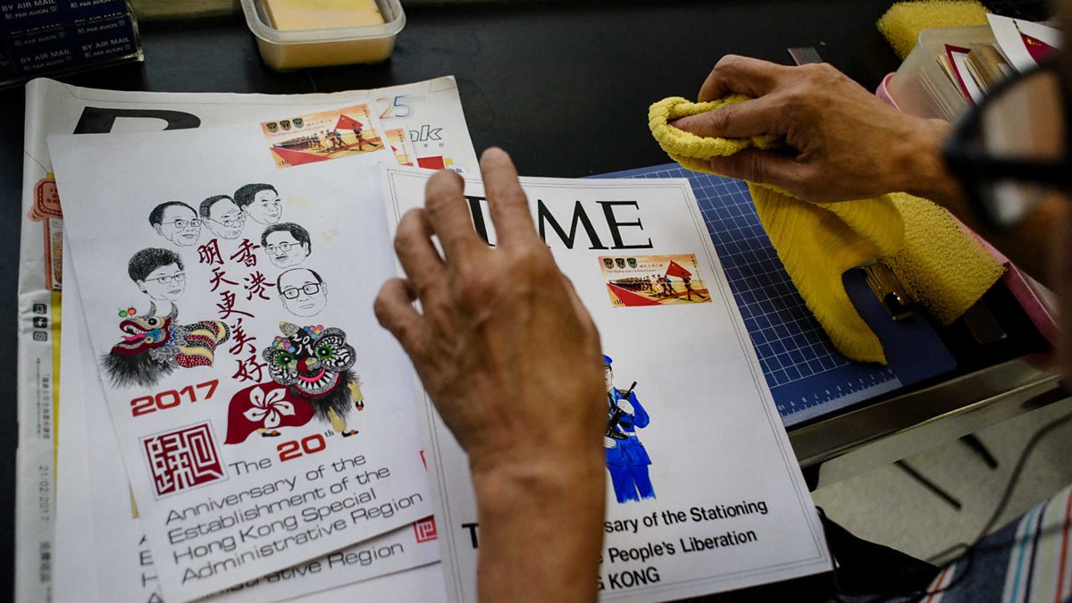 (Picture: Stamp collector Lok Ka-chung, 70, dabs a stamp issued to mark 20 years since the city was handed back to China by Britain Picture Credit: ANTHONY WALLACE/AFP/Getty Images)