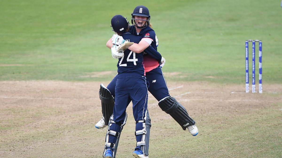 Somerset's Anya Shrubsole speaks to Henry Moeran after hitting the winning runs to put England into the World Cup Final.