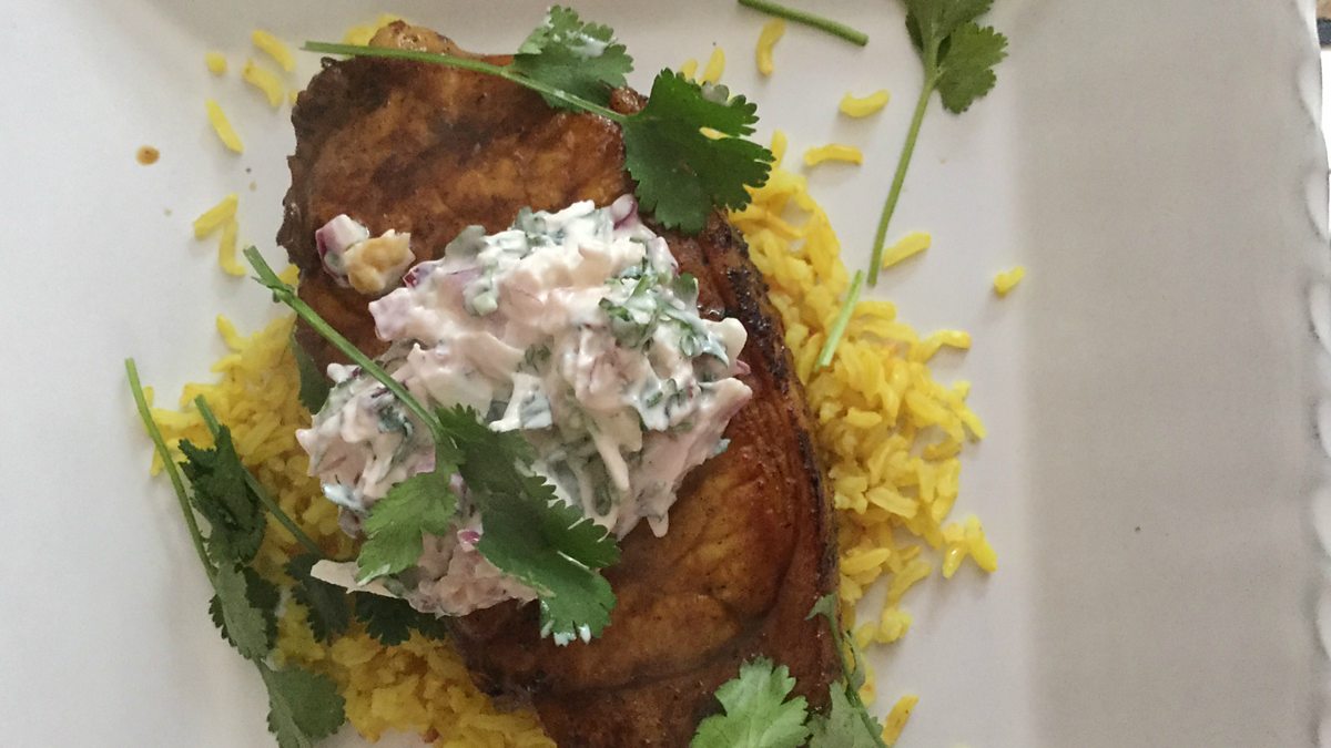 Turmeric and honey glazed pork chops, turmeric rice and coconut and ginger yoghurt sambal