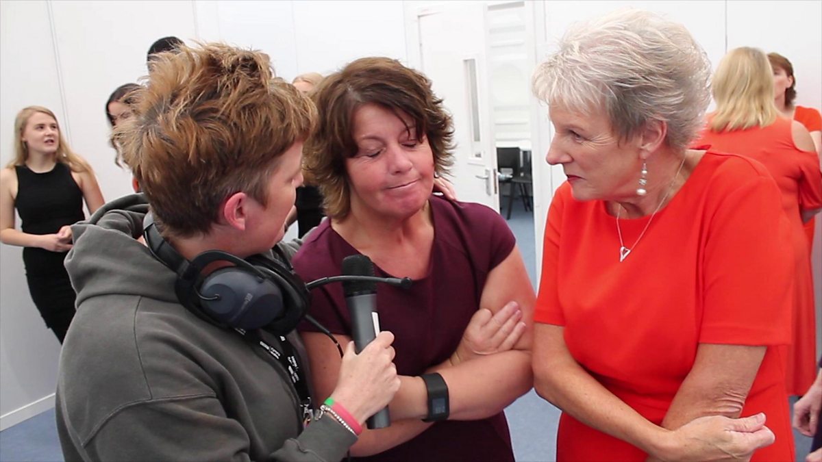 Nia Lloyd Jones sydd cefn llwyfan yng nghanol cyffro y corau.