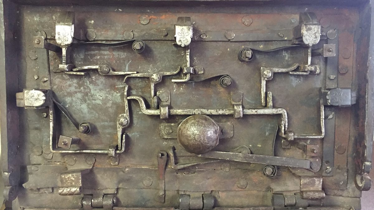 Colin Spackman from Wellington Museum shows his 300-year-old chest to Charlie Taylor.