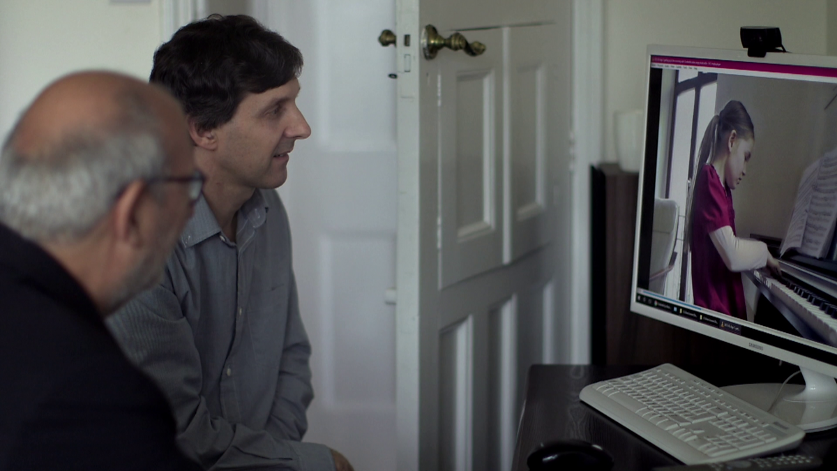 Alma's father shows home movie of Alma aged 7, playing a piece of music she has just composed. We see it build to become the melody of the ugly sisters in Cinderella.