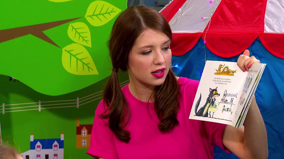 Linda reads Dè an uair a tha e, a Mhgr Madadh? to the children.