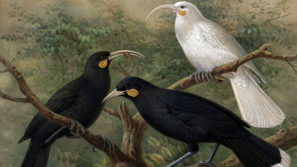 (Image: Watercolour of three Huia birds. Credit: Johannes G. Keulemans.)