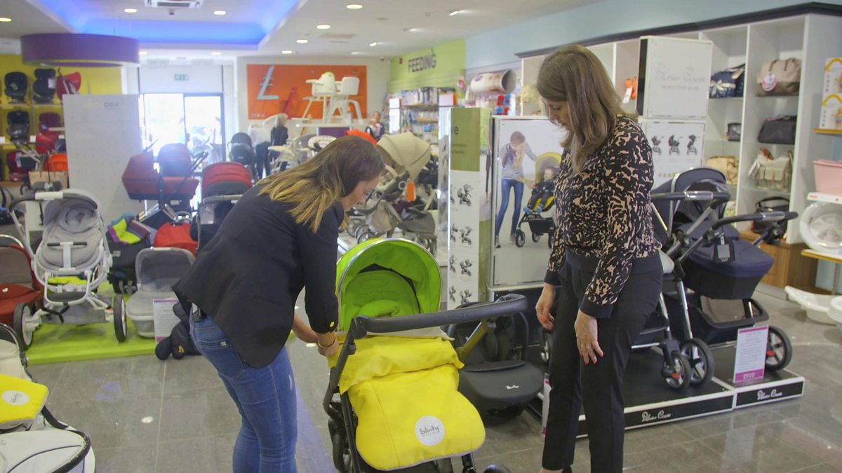 Sarah gets shown how the Blinky is so easy to use on children's prams.