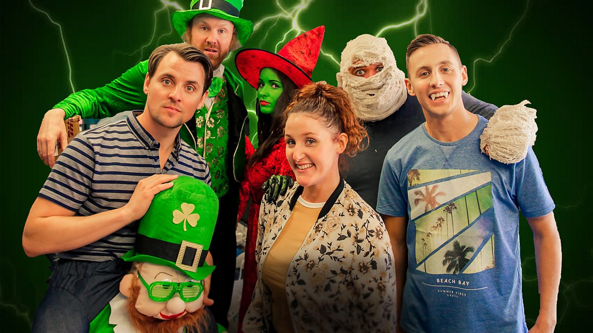 Two employees at a fancy dress shop are accosted by a vampire, witch and mummy.