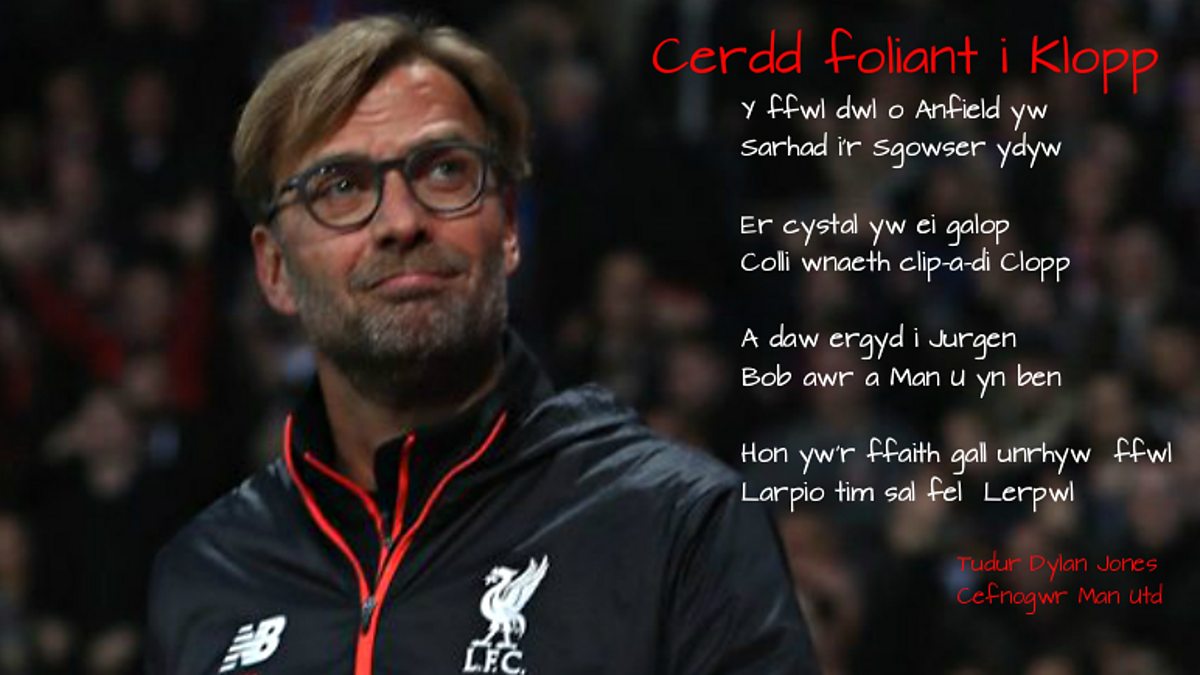 Tudur Dylan Jones â'i gerdd o "fawl" i Jurgen Klopp