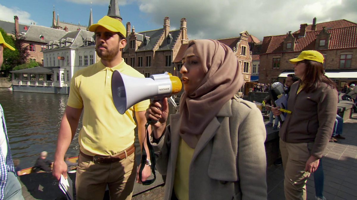 Liz fails to impress Claude as she herds tourists through Bruges.