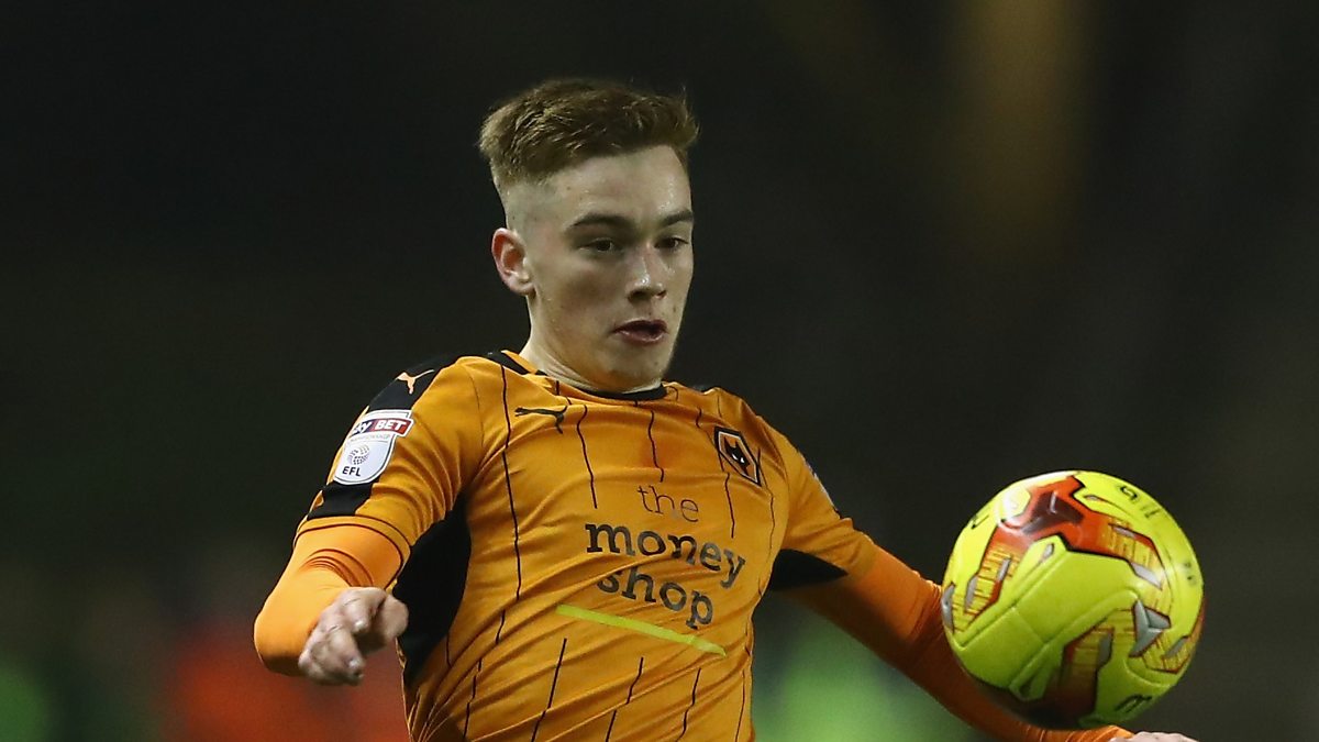 Connor Ronan speaks to Andy Moon after joining Portsmouth on loan from Wolves
