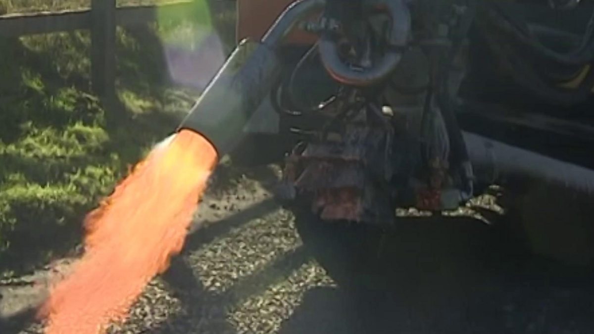 A fire breathing dragon is out on the road. The machine fixes 150 potholes a day. Cambridgeshire County Council hope Dragon Patcher will save money and time repairing the road.