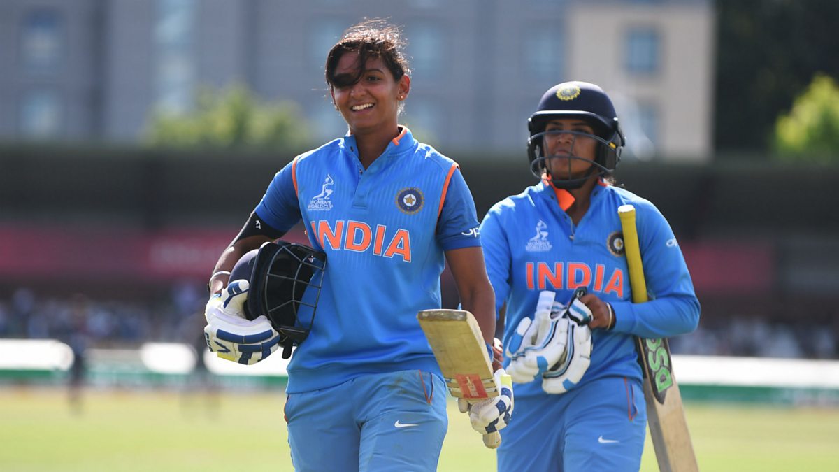 (Photo: Harmanpreet Kaur and Veda Krishnamurthy of India walk of the pitch during the Semi-Final ICC Women's World Cup 201. Credit: Getty Images)