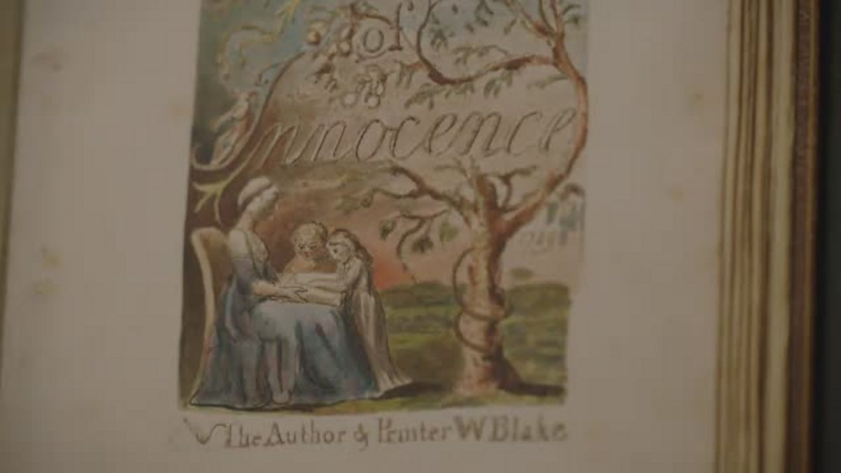 Philip Pullman examines a rare first edition of William Blake's 'Songs of Innocence', published in 1789, at the Bodleian Library in Oxford. It's a work that he has loved ever since he was a child.