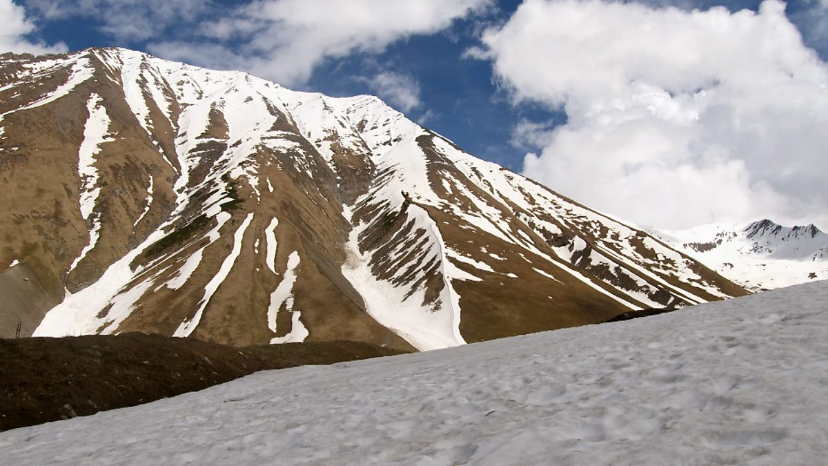 After a trip along the Georgian Military High Road, Michael boards a helicopter for a birds eye view of the 5,000 metre peak of Mount Kazbek.