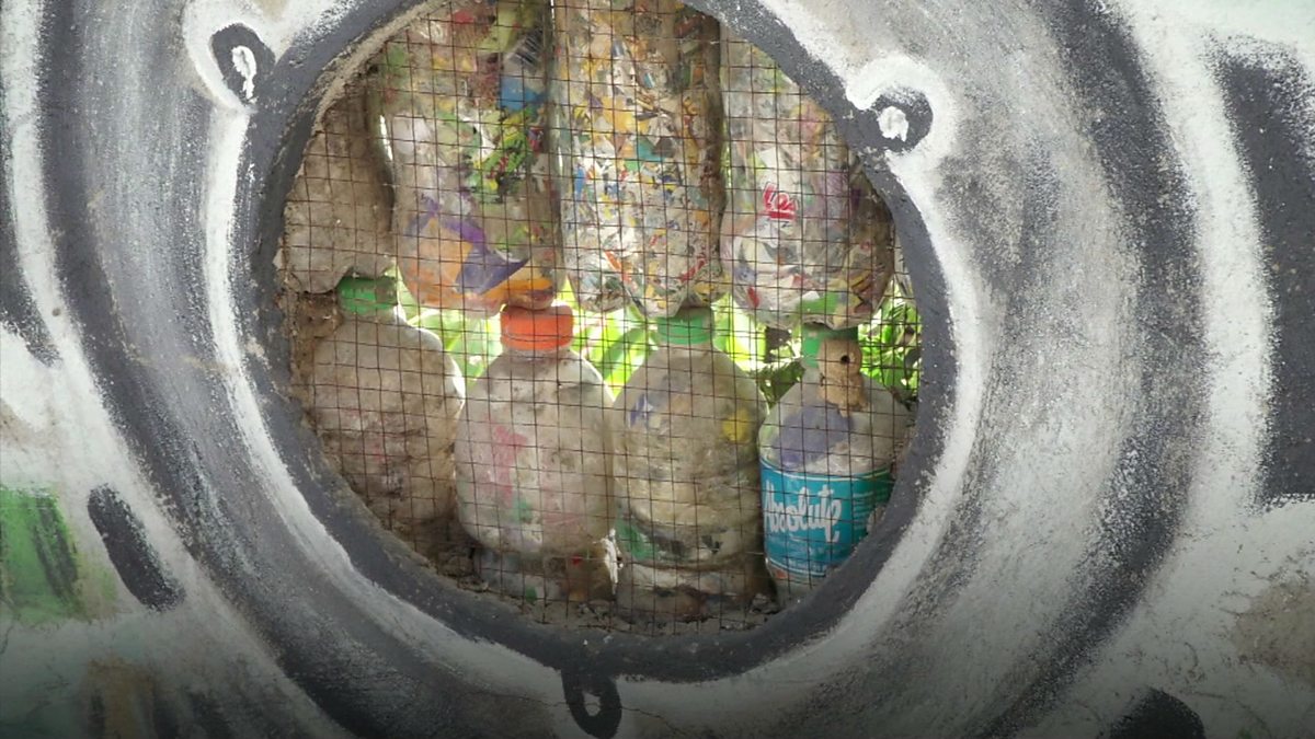 (Image: Plastic eco-bricks embedded in to a constructed wall. Credit: Howard Johnson / BBC)