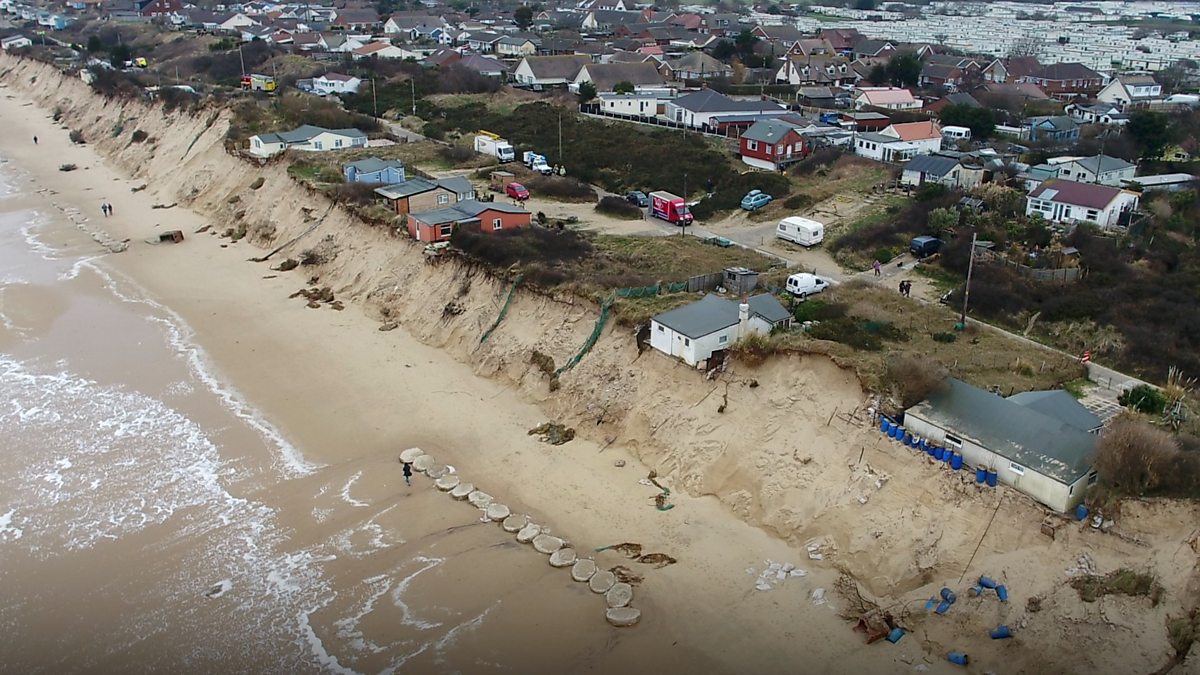 Drone footage shows evacuated homes in a precarious position on the Norfolk coast, with five most at risk.