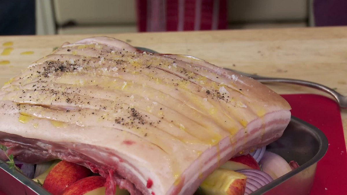 Tha Ruaraidh a' ròstadh pìos feòil muice