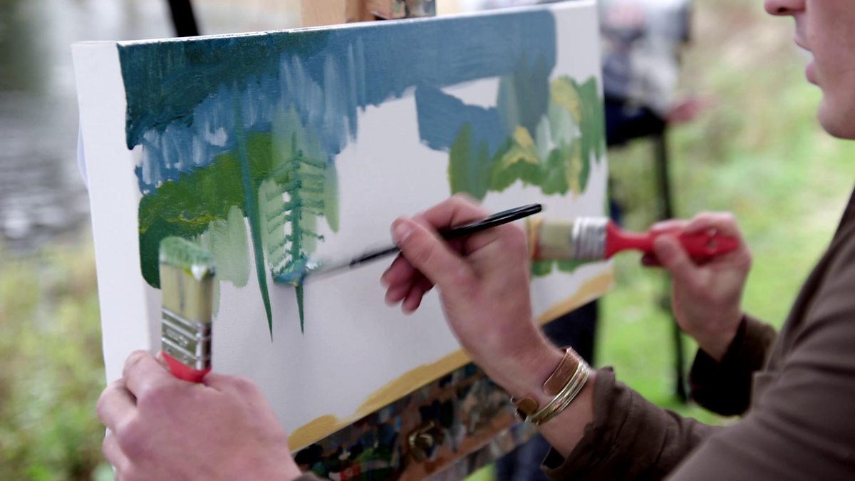 Artists work together mixing paint to find realistic colours and tones in the environment.