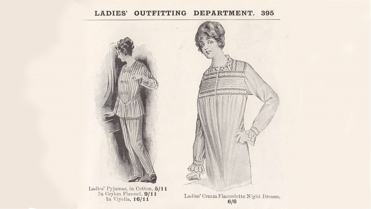 In the days of Zeppelin raids, fleeing fashionably was a hot topic in newspapers and magazines. Comedian Susan Morrison talks to costume historian Lucie Whitmore of Glasgow University who’s been investigating at the Museum of Edinburgh. For the first time ever, women were in regular peril of being seen in their nightwear outside the home. How to deal with it? One route was lacy and be-ribboned boudoir caps - so what if you had your curlers in? Nobody could see them and you’d still look lovely, but another route was more racy - pyjamas! The Great War was the first time it became really acceptable for women to wear pyjamas to bed. But faced with an air raid the decision was yours - flirty frivolity and the lacy boudoir cap or practical functionality and the pyjama route. Sales of both rocketed and nightwear was never the same again. (Photograph, courtesy of Lucy Adlington/History Wardrobe).