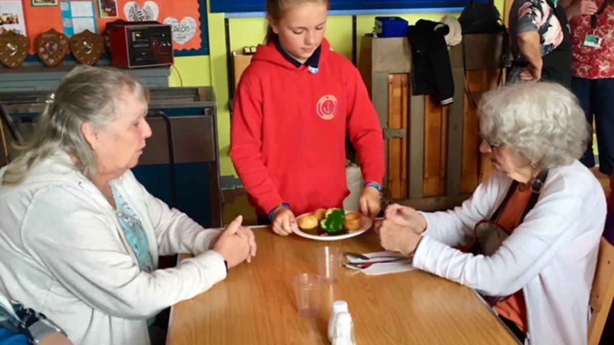 Hanes plant Ysgol Hirael ym Mangor yn helpu gyda chlwb cinio i'r henoed.