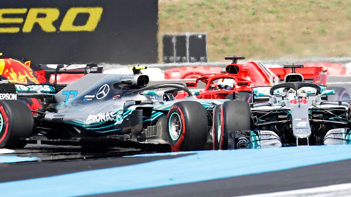 Ferrari's Sebastian Vettel and Mercedes' Valtteri Bottas collide at the opening corner.