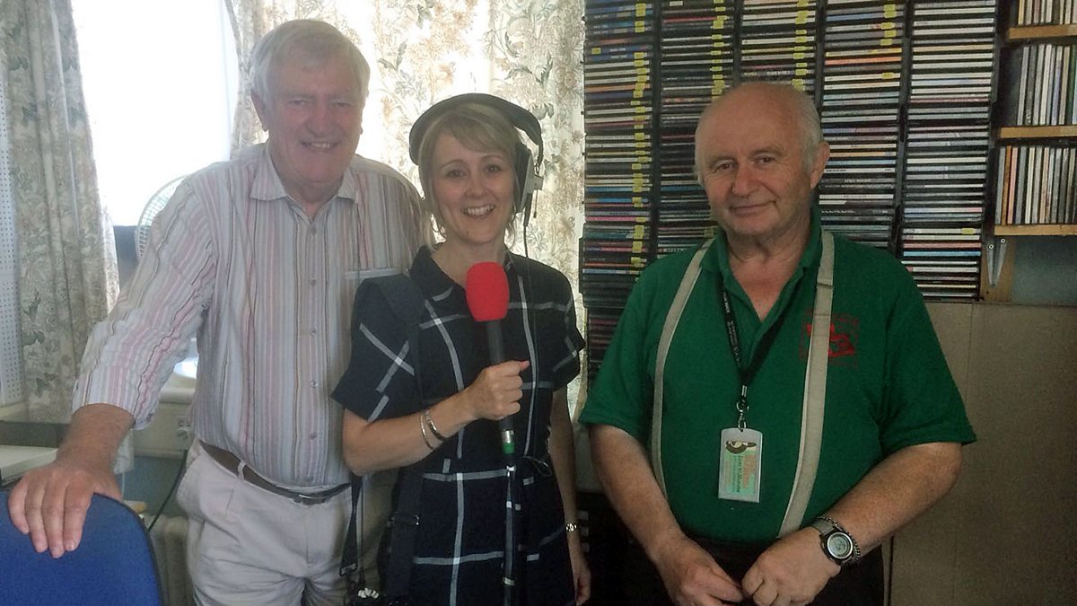 Rebecca Hayes sy'n cael hanes Radio Glangwili gan Sulwyn Thomas a Ian Williams.