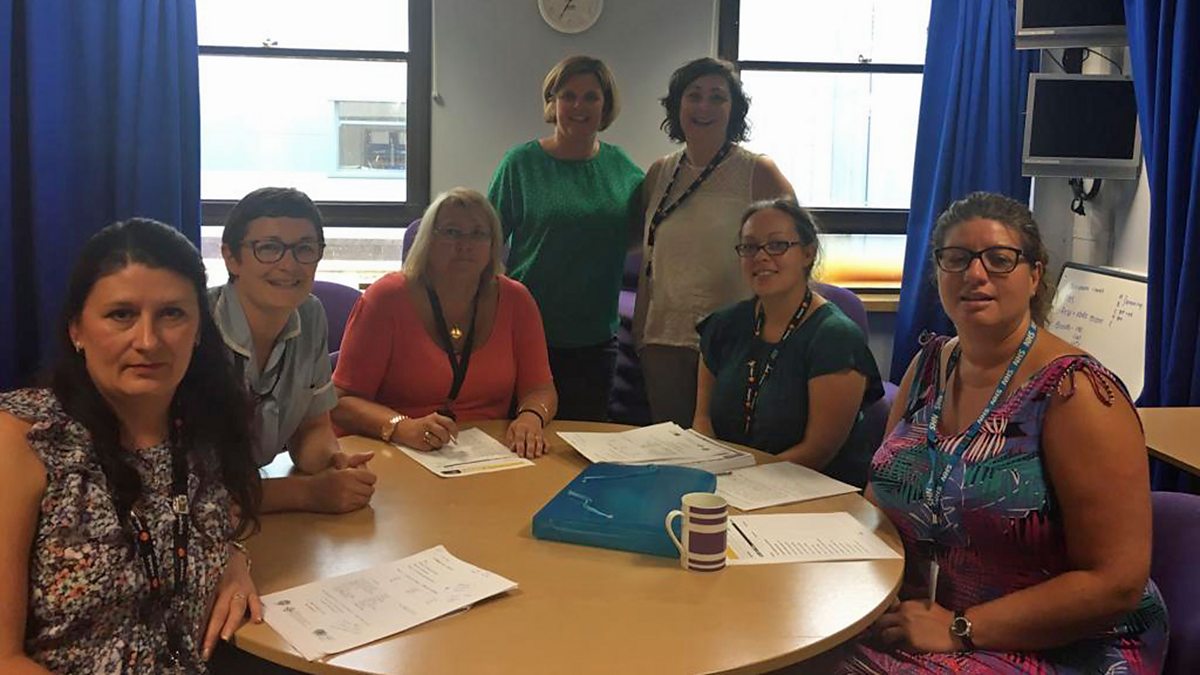 Nia Lloyd Jones sy'n sgwrsio gyda dysgwyr Cymraeg Ysbyty Gwynedd.