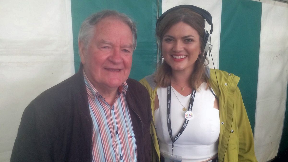 Ffion Emyr sy'n dal fyny gyda Dafydd Iwan ar ddiwrnod olaf Steddfod Caerdydd.