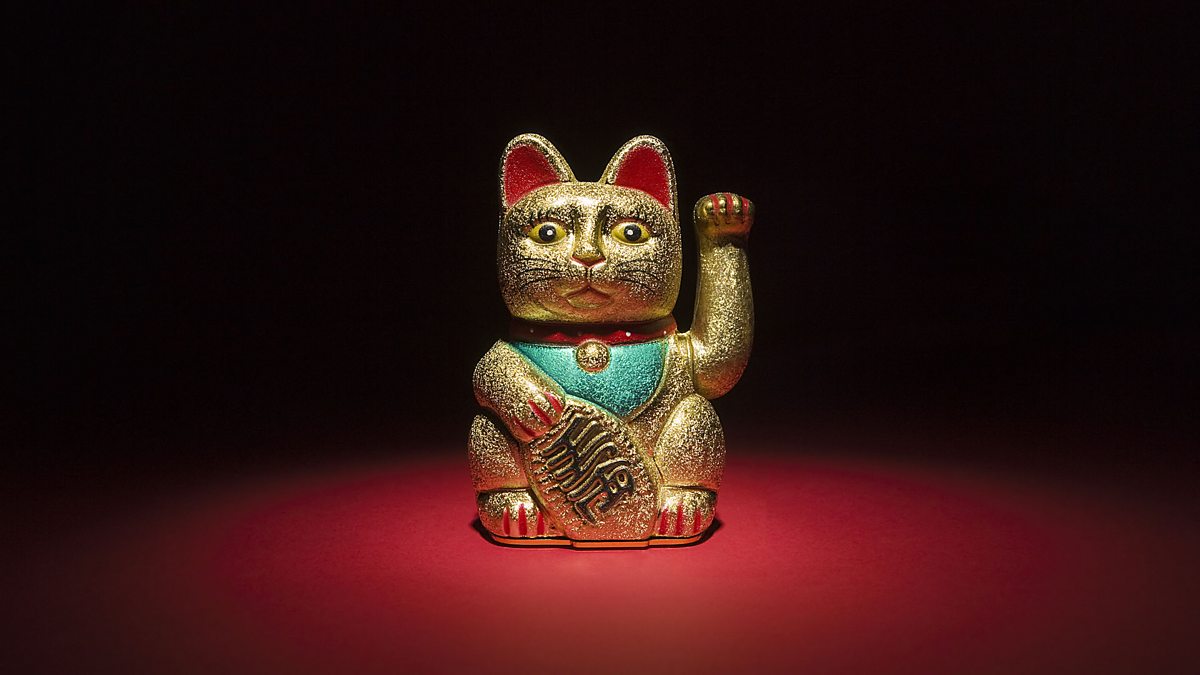 (Image: Chinese lucky cat Maneki Neko on a red background, with a small pool of light. Credit: Getty Images)