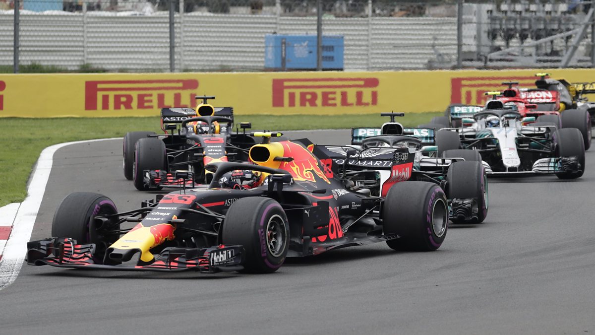 Red Bull's Max Verstappen takes advantage if his teammate Daniel Ricciardo's poor start to take the lead of the Mexican Grand Prix. Lewis Hamilton also overtakes the Australian to move into second place.