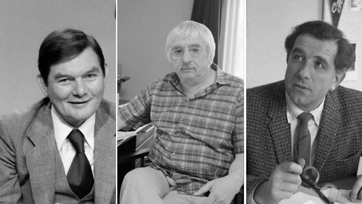 Carwyn James yn holi Meredydd Evans ar raglen "Tu ôl i'r Meic" o 1975. Gwesteion eraill y rhaglen oedd y dramodydd Gwenlyn Parry a hefyd Eic Davies.